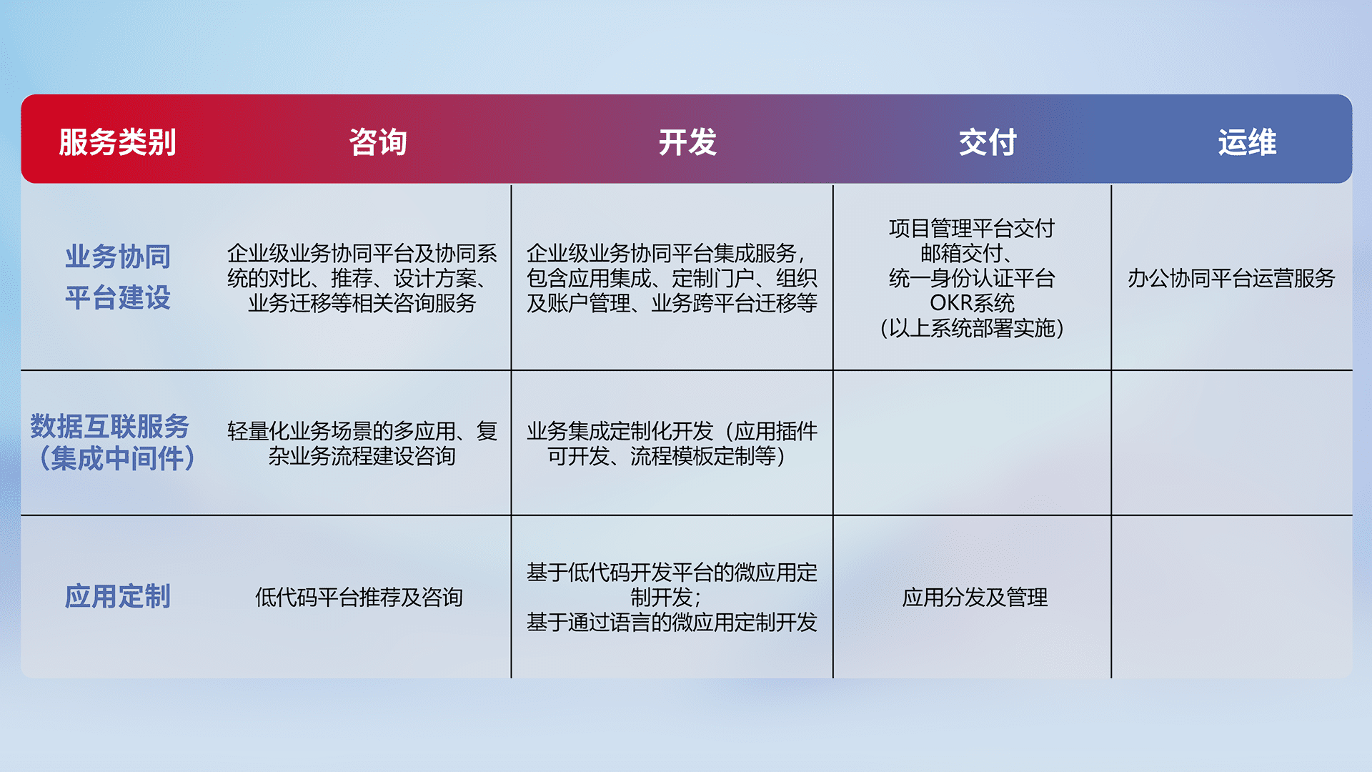 针对钉钉、、、企微、、IDaas等平台级产品提供产品的规划、、方案、、、交付、、定制化开发等服务,,,,实现如统一协同办公、、智能客户服务、、、混合会议管理、、、、智能数据查询、、等业务场景,,,,实现数字化转型。。