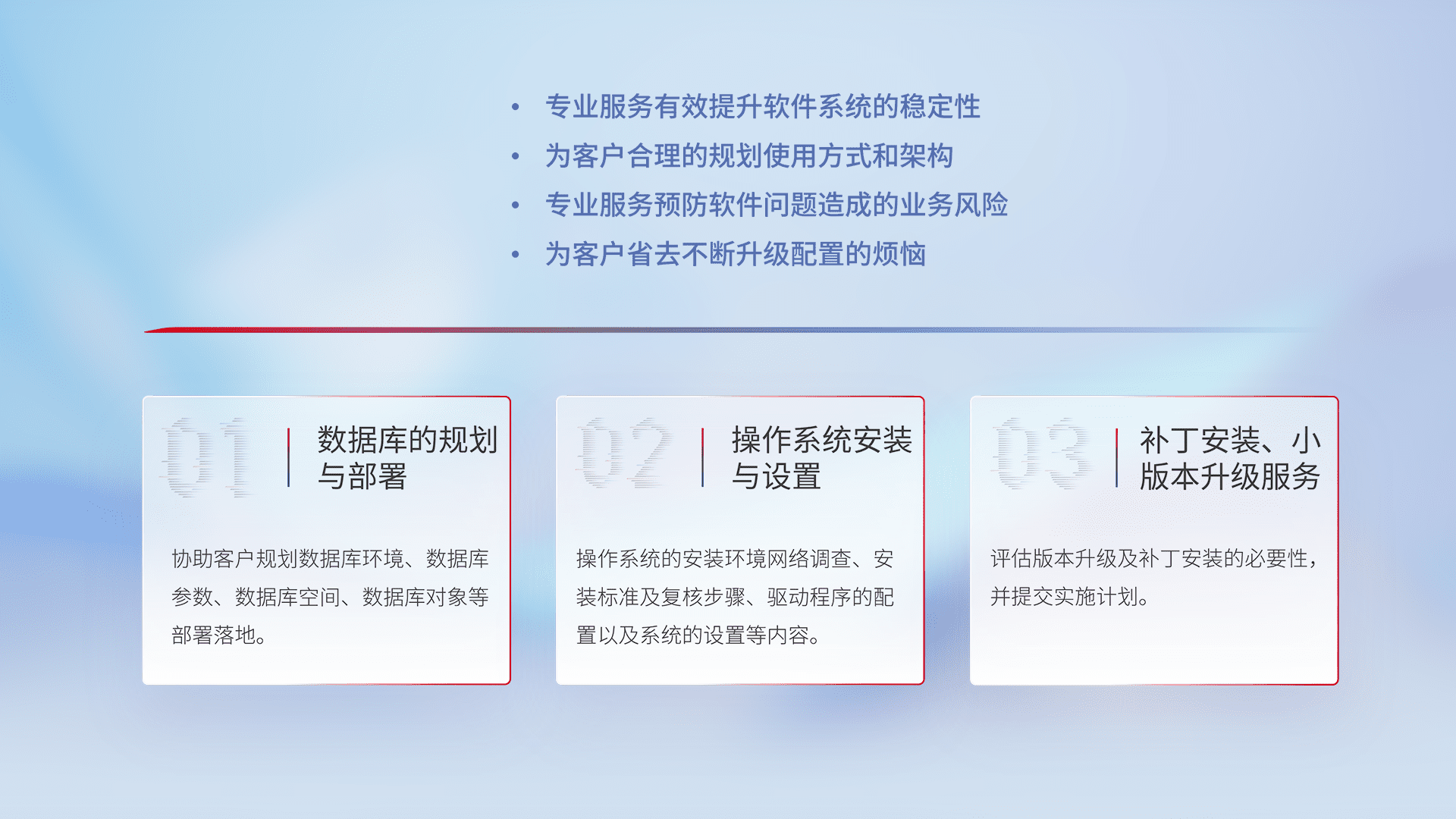 为客户提供软件规模升级、、快速部署、、按需配置的专业服务,,从数据库的规划与部署到操作系统的安装与设置,,,再到补丁安装和小版本升级提供支持。。。。