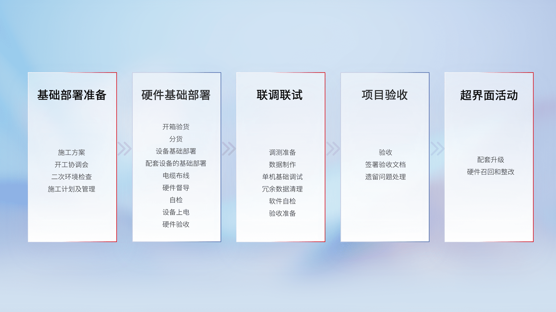 从基础部署准备、、、、硬件基础部署、、联调联试、、、、项目验收、、、、越界面活动的全过程可追溯,,保证施工质量和进度。。